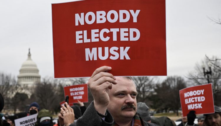 People protest against President Donald Trump and Elon Musk’s nonofficial Department of Government Efficiency on Wednesday near the U.S. Capitol.
