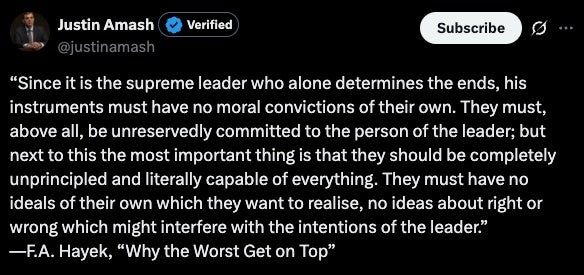 Noem’s inability to define a fundamental Constitutional right left many aghast, including Amash, who also shared a quote by Friedrich Hayek, a 20th century academic often admired by libertarians: