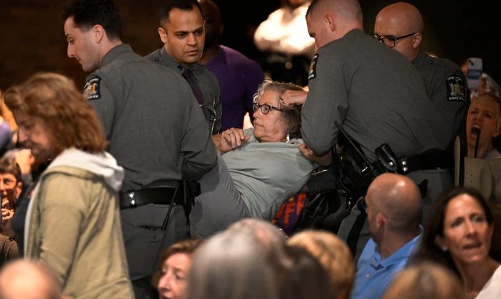 The woman dragged away was identified by The Journal News as Emily Feiner of Nyack, New York, whose Bluesky profile describes her as a Jewish retired social worker and mother of two.