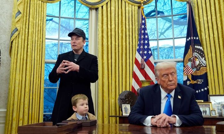 Trump listens as Musk, joined by his son, hold court in the Oval Office earlier this month.