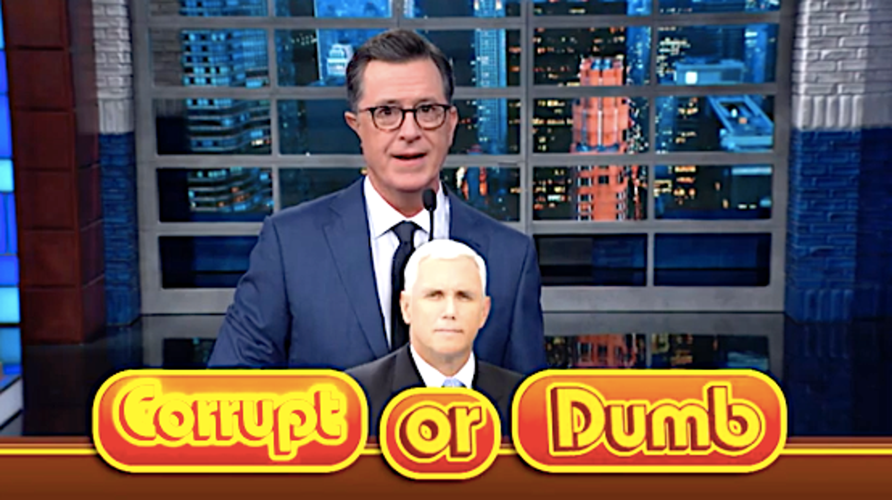 That means, Colbert concluded, that if an impeachment inquiry brings down Trump, Pence falls too. In a mock game “Corrupt or Dumb,” the late-night host scored the vice president as both.