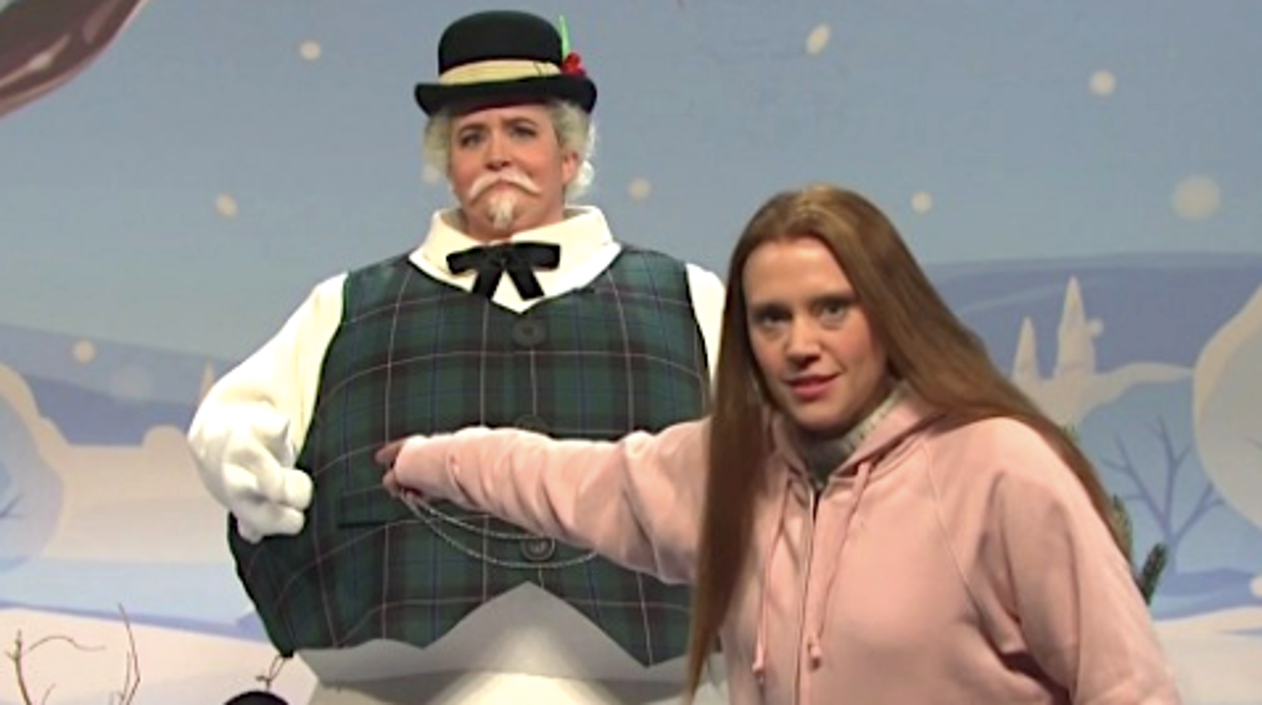 Aidy Bryant’s Sam the Snowman ends up baring deep rifts across the country with a peek into various dinner conversations in the cold open before Kate McKinnon’s convincing Greta Thunberg pops up with a chilling warning.