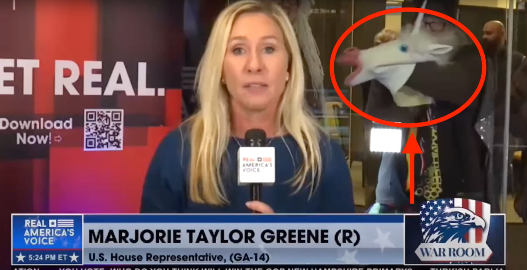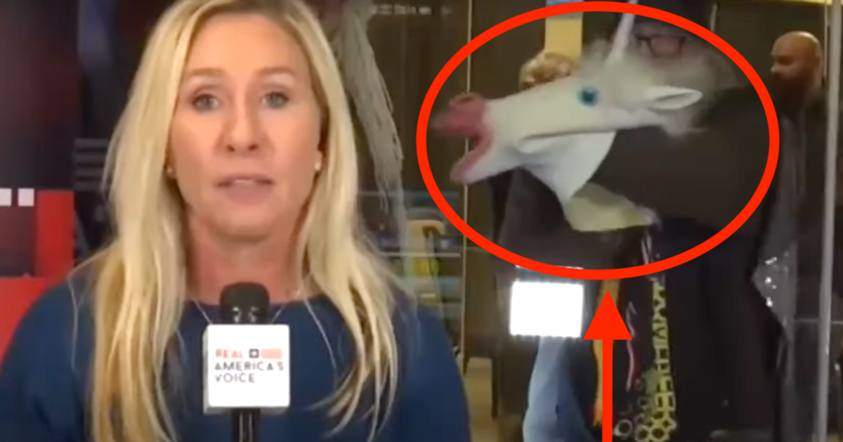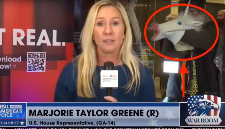 Rep. Marjorie Taylor Greene Photobombed By ‘Buffoon’-icorn In Bizarre TV Moment