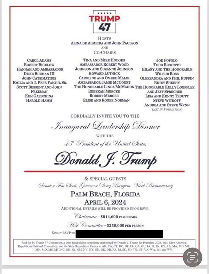 The fundraiser for a joint committee called “Trump 47” is to be held on April 6, according to an invitation obtained by HuffPost, with a “chairman” level donation set at $814,600 per person, and a “host” level at $250,000.