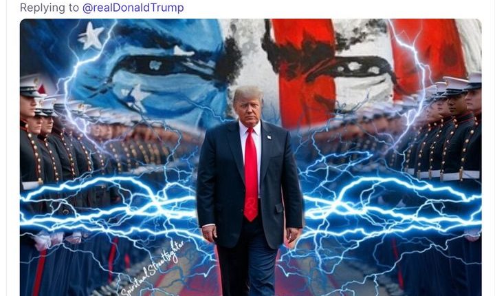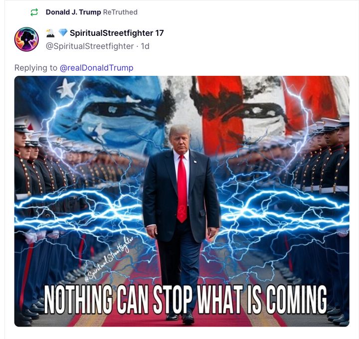 “NOTHING CAN STOP WHAT IS COMING,” reads text overlaid on one photo illustration of Trump walking somberly between two rows of soldiers as he is flanked by lightning bolts. A pair of eyes painted with stars and stripes fills the space where the sky should be.
